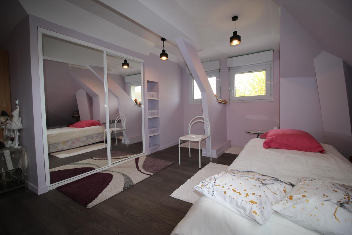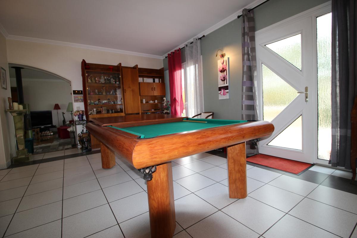 Au rez-de-chaussée : Entrée sur une pièce de 30 m² avec billard, séjour et salle à manger traversant de 40 m² avec poêle à bois, cuisine équipée ouverte sur le jardin, dégagement, WC, suite parentale avec dressing et salle de bains avec douche et baignoire, bureau.